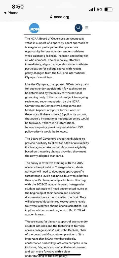 NCAA Mark Everett said in a staetment “like the Olympics, the updated NCAA policy calls for transgender participation for each sport to be determined by the policy for the national governing body of that sport, subject to ongoing review and recommendation by the NCAA Committee on Competitive Safeguards and Medical Aspects of Sports to the Board of Governors. If there is no NGB policy for a sport, that sport’s international federation policy would be followed. If there is no international federation policy, previously established IOC policy criteria would be followed.”