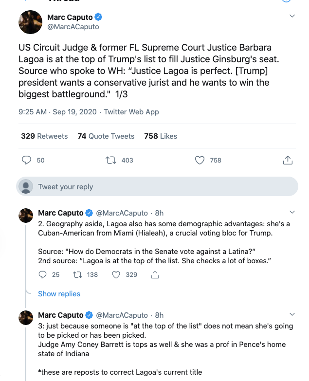 A report from Marc Caputo suggests both Barbara Lagoa and Amy Coney Barrett are at the top of the list.
