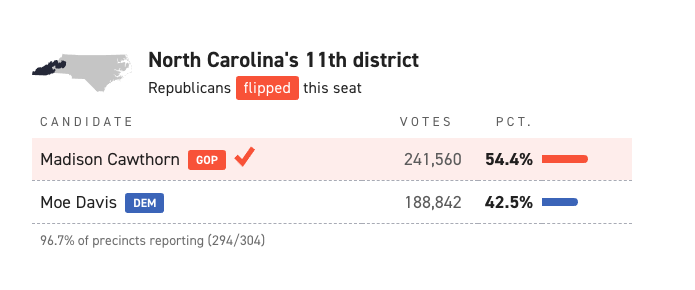 Madison Cawthron, a Republican who spoke at the GOP convention for Trump, has won his race in North Carolina and flipped a blue seat red.