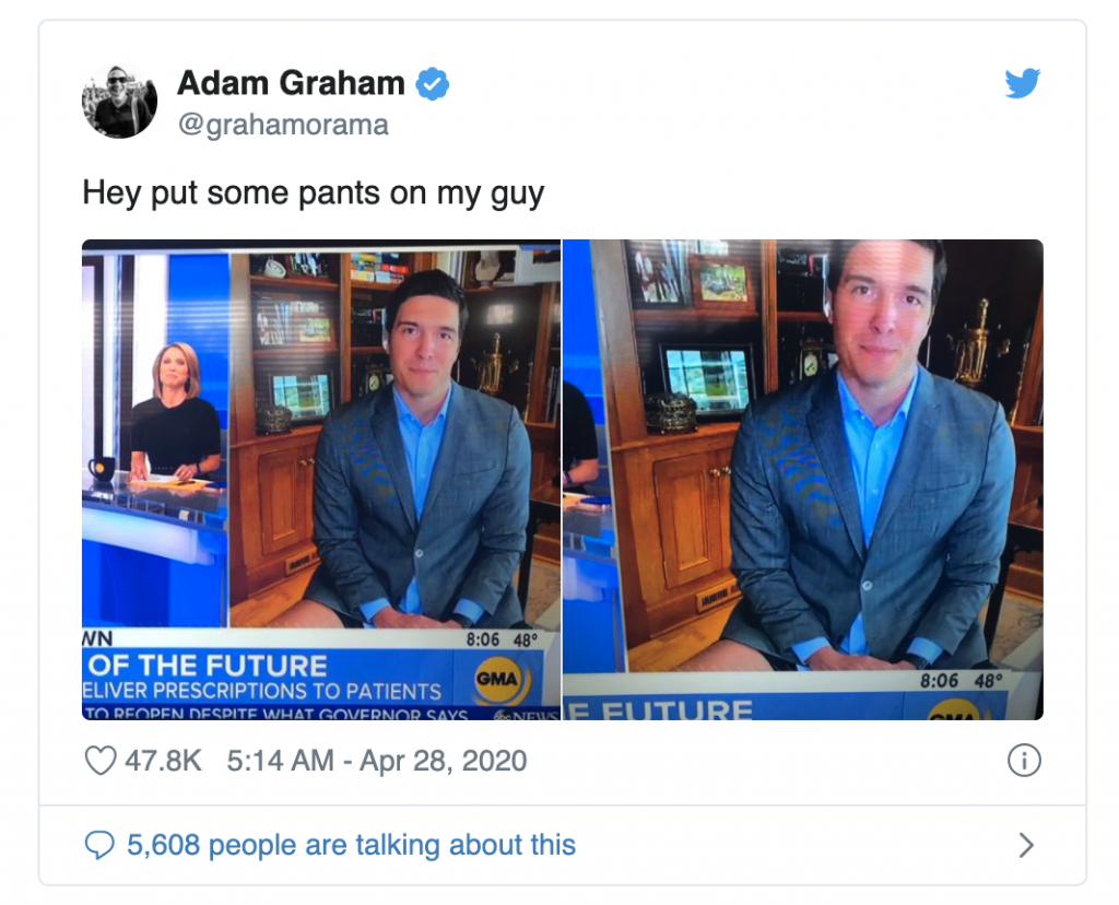 “Any sartorial tips from (online commenters) who are wearing a belt, trousers and shoes during their work video calls at home are most welcome,” he wrote on Twitter. “Now, back to work. Wearing pants.”