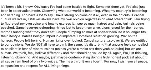 “Cancel culture….so over it. We are entitled to our opinions. We do NOT all have to think the same. It’s disturbing that anyone feels compelled to be silent in fear of repercussions (unless you’re a racist ass then yeah be quiet) but we are human. We think, feel, believe differently and that should be valued by all. Again, I’m just thinking, listening, observing. And maybe, just maybe contemplating doing a truly honest podcast about it all cause i am tired of only two voices. Their is a third. Even a fourth. For now, I wish you all peace, compassion and respect for ALL living things,” Doherty adds.