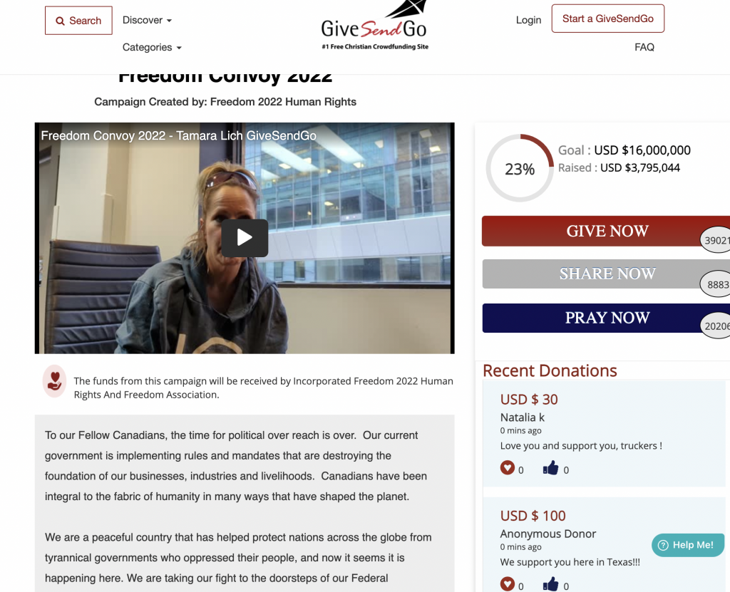 Tamara Lich, an organizer with Freedom Convoy 2022 said “We’ve decided to team up with an organization called GiveSendGo, which is going to enable us to get donations into the hands of truckers much much quicker.”