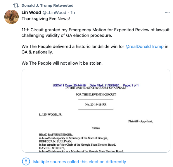 Moments ago, pro-Trump attorney Lin Wood announced the “11th Circuit granted my Emergency Motion for Expedited Review of lawsuit challenging validity of GA election procedure.”