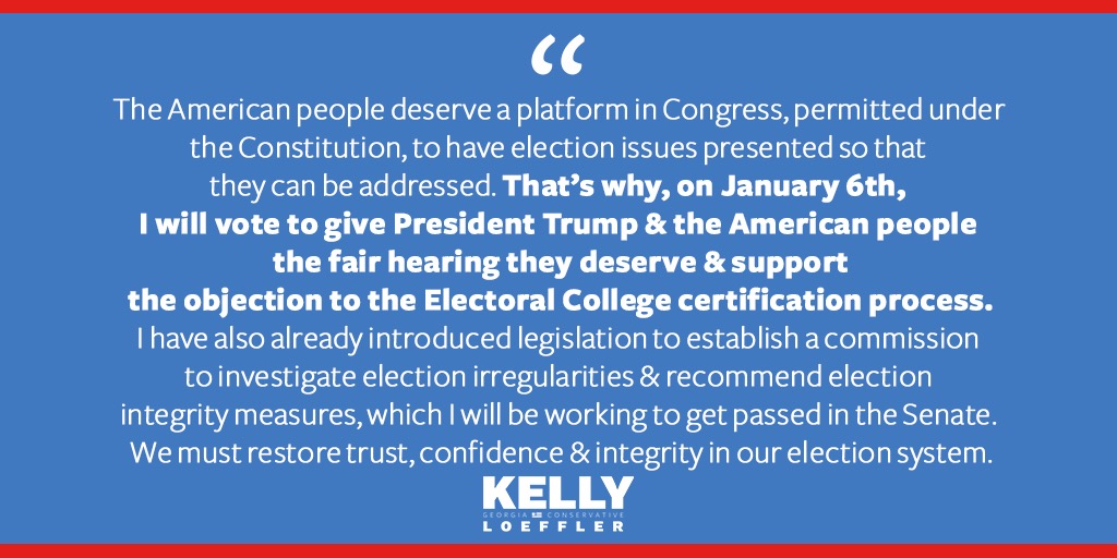 Republican Senator Kelly Loeffler has vowed to object to the electoral college certification January 6th.