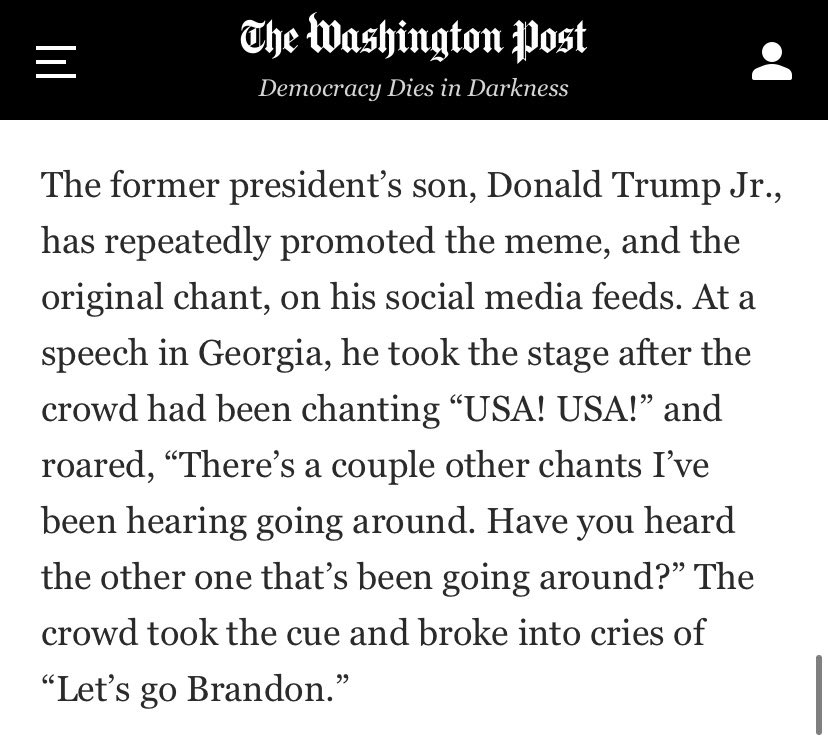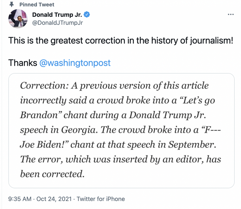Wapo admitted a previous version of the article said a crowd listening to Don Jr. had broke into a “let’s go Brandon” chant when in reality they had broken into a “F-k Joe Biden” chant.