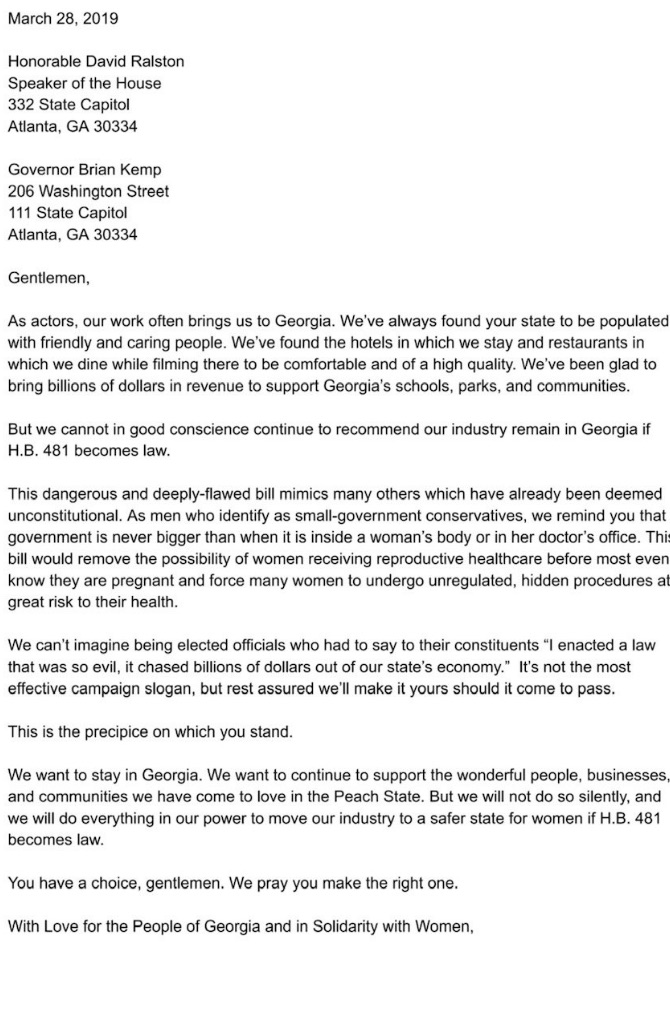 The letter was sent Thursday morning to Georgia House Speaker David Ralston and Georgia governor Brian Kemp, but has been circulating on social media all day.
