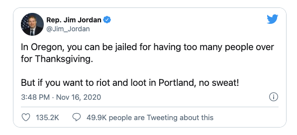 Unimpressed with Governor Kate Brown’s actions, Republican Jim Jordan tweeted mockingly “In Oregon, you can be jailed for having too many people over for Thanksgiving. But if you want to riot and loot in Portland, no sweat!”