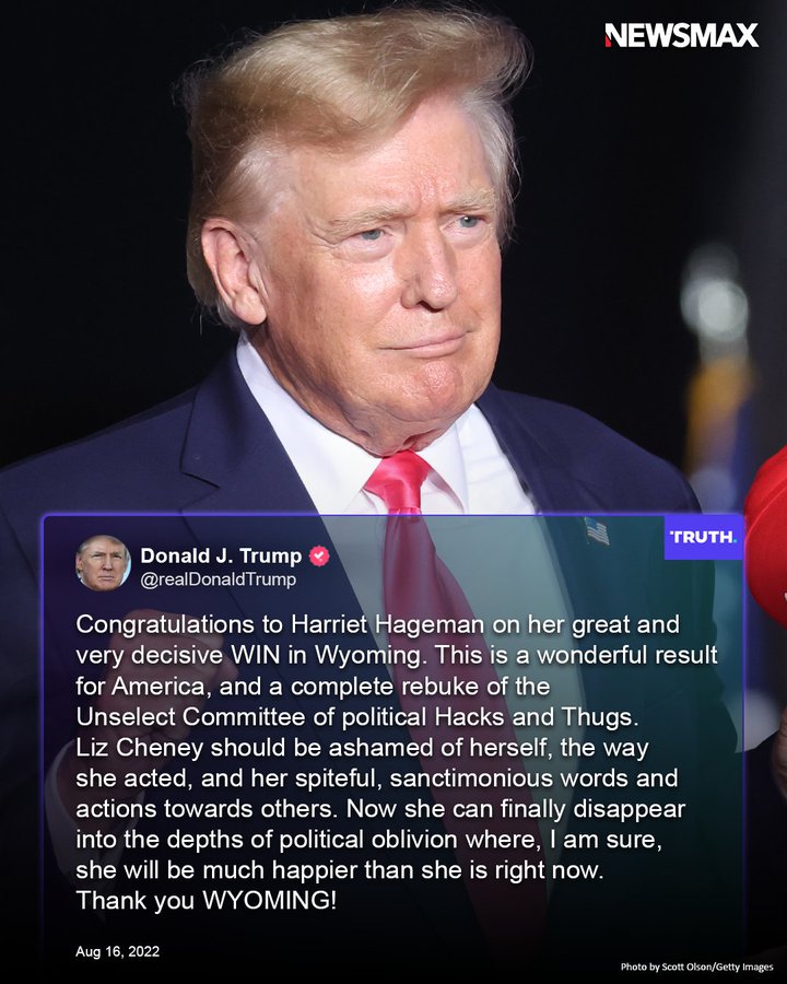 Trump wrote earlier in the day on Truth Social “If Liz Cheney loses tonight, the Fake News Media will do everything within their power to play it down and pretend that it was not a referendum on the Unselects – That it was no big deal. Actually, it would be a very big deal, one of the biggest!”